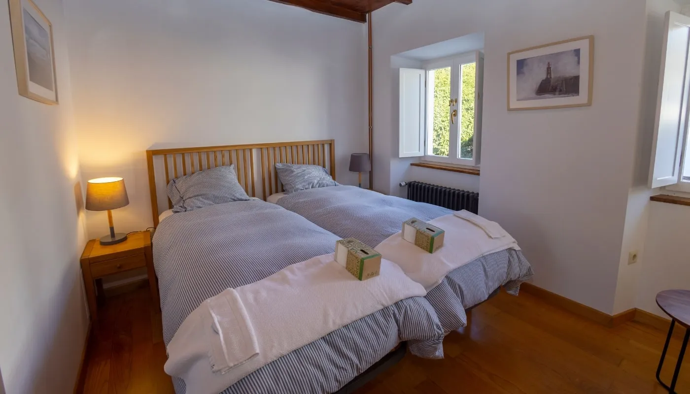 La Casa Jovellanos tiene capacidad para 6 huéspedes en 4 cómodas habitaciones distribuidas en 2 plantas. Dos habitaciones dobles, una con dos camas individuales de 90 cm y otra con una cama de matrimonio de 150 cm, además de dos habitaciones individuales con cómodas camas de 130 cm.